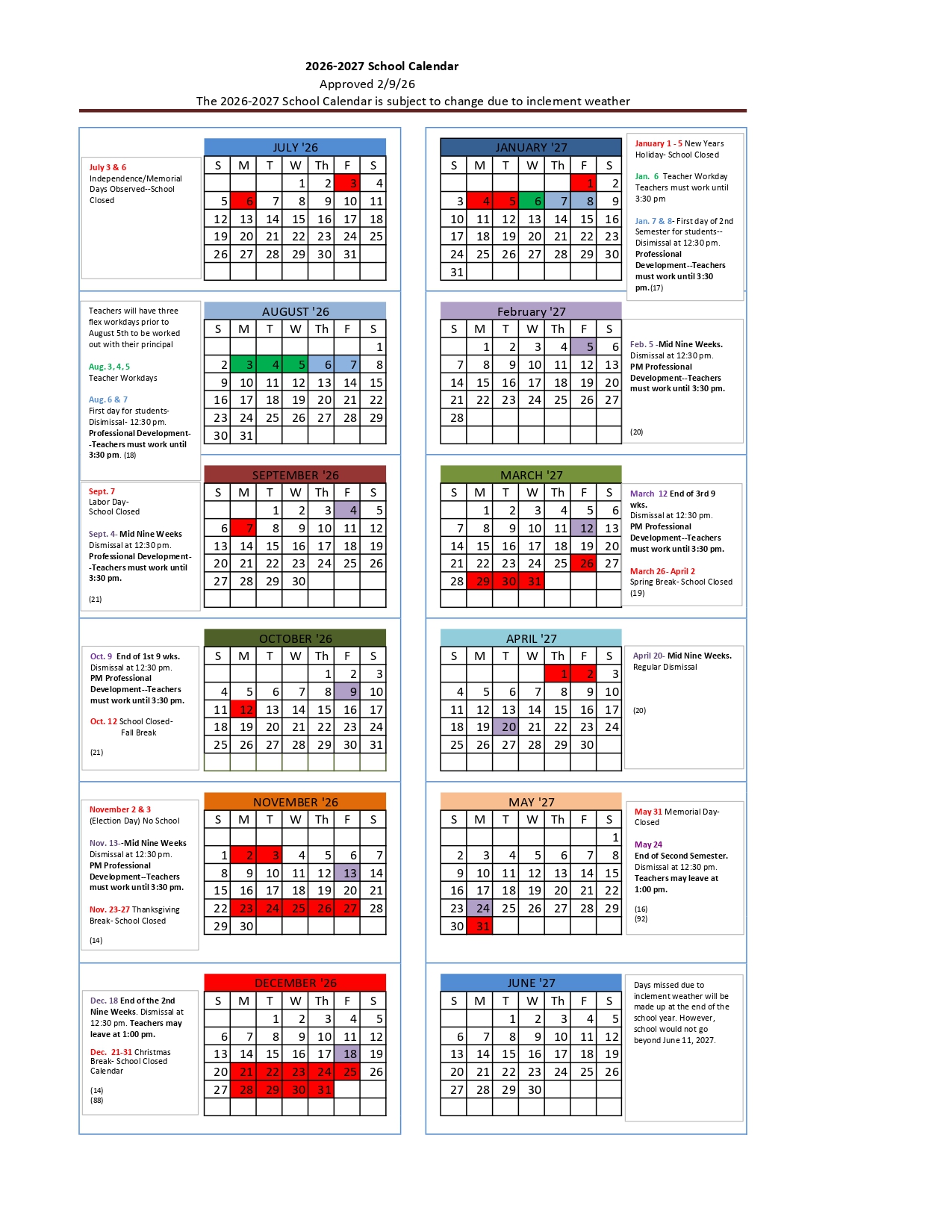 The 2026-2027 school calendar was approved (8-0) at the regularly scheduled board meeting on 2-9-26. |