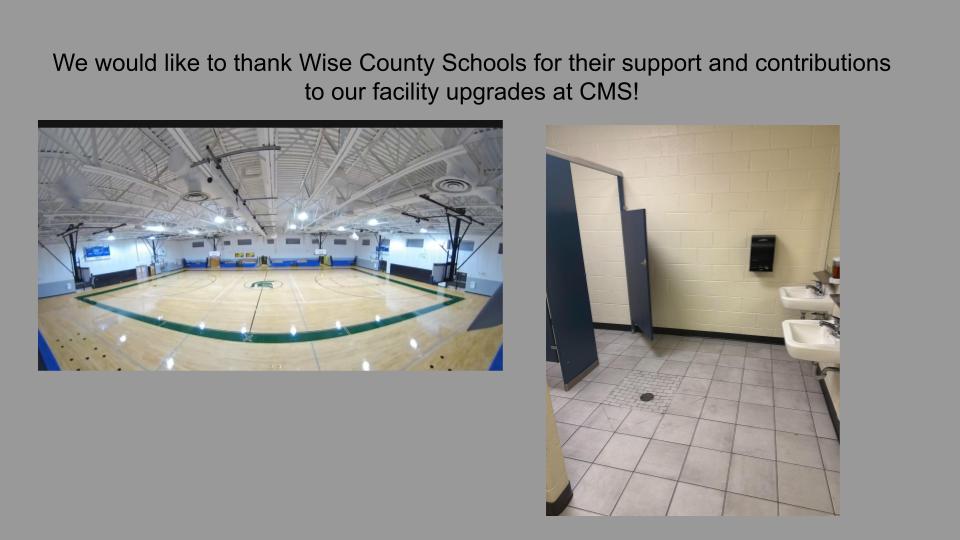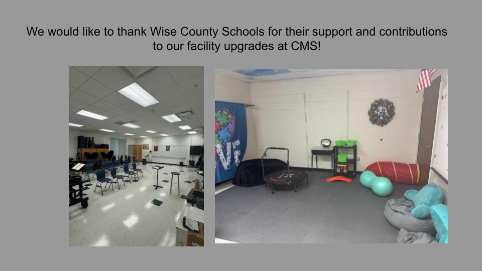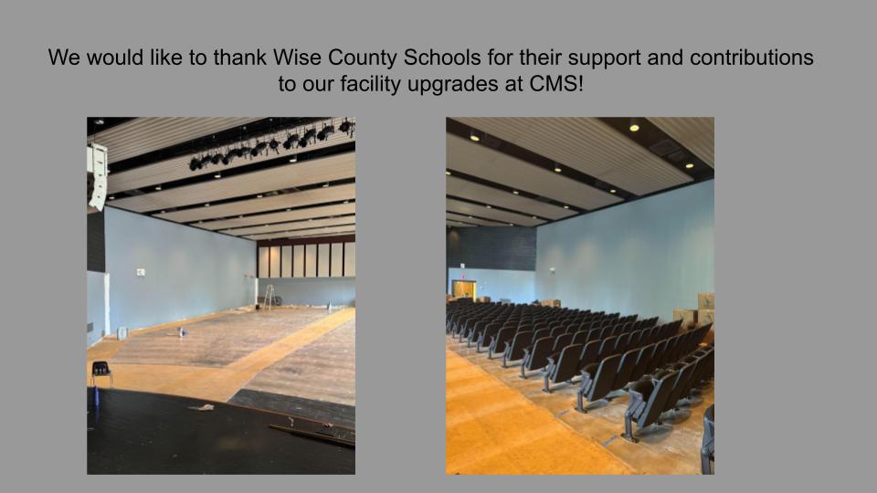 ii.) Principal's Presentation--Coeburn Middle School - Deventae Mooney: Mr. Mooney would like to thank the Wise County Public School Board for the following school upgrades: -Gym floor (sanded and painted) -New locker room renovation -New tile in the band classroom -Funding for a sensory room -Auditorium seating -Funding for a new school sign